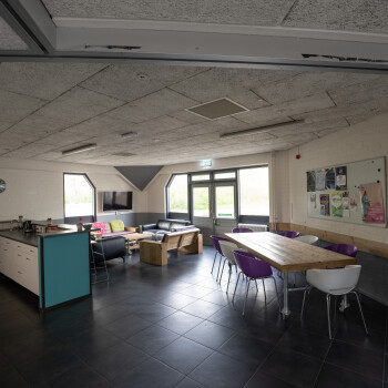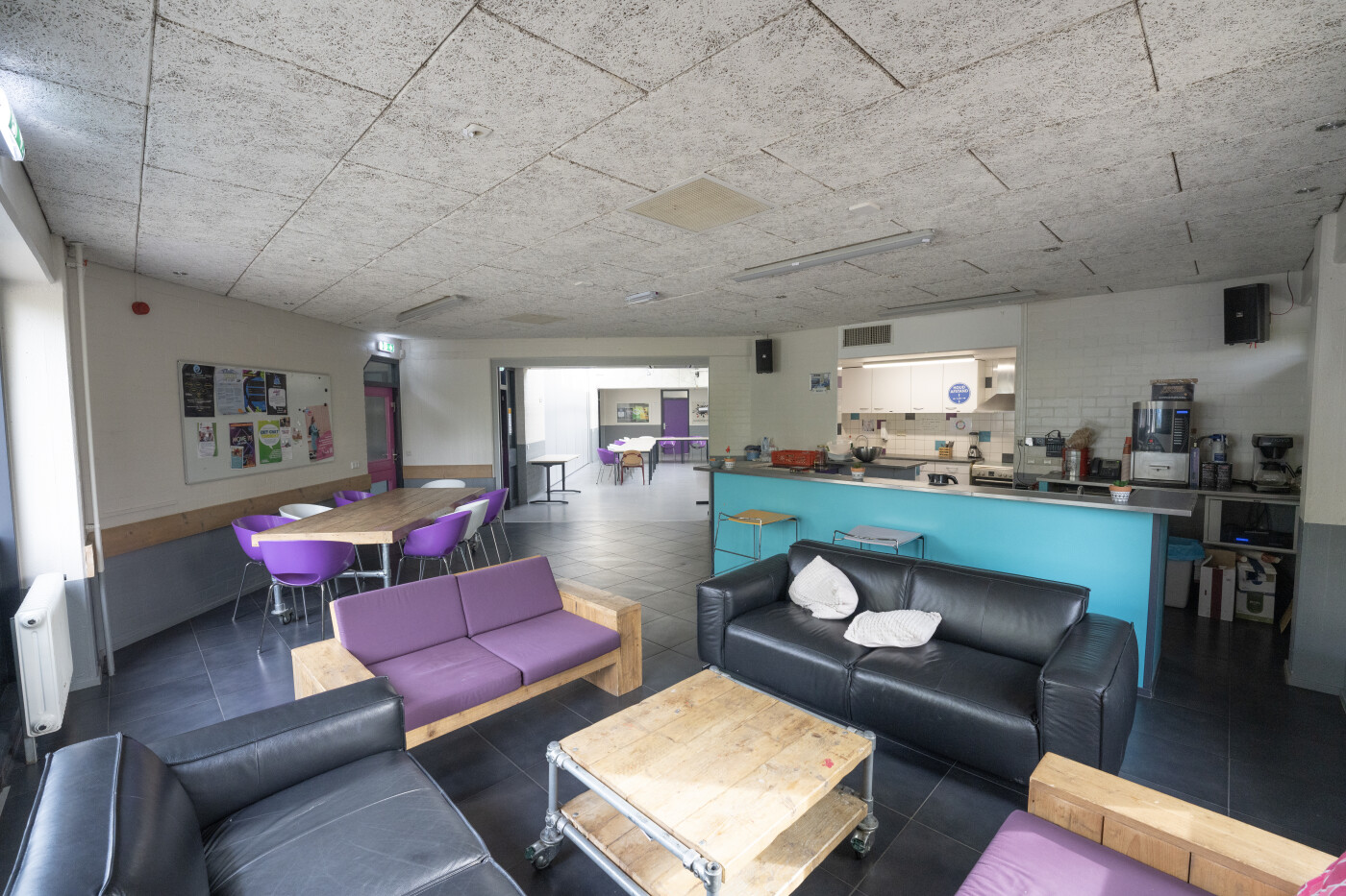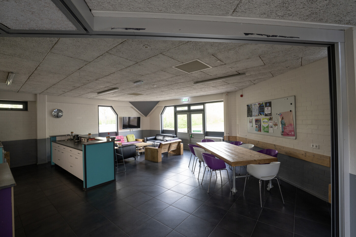 De huiskamer is te huur en geschikt voor ongeveer 15 personen, deze ruimte is voorzien van tafels, stoelen, een zithoek en een whiteboard. Daarnaast is er in de woonkamer ook een bargedeelte.