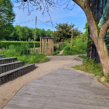 Ons Buitentheater en Buitenterras liggen in de tuin naast ons gebouw. Het podium bestaat uit een houten vlonder, de zitplaatsen zijn opgebouwd uit gestapelde stenen met een houten zitvlak in de vorm van een halfronde "arena". Het buitenterras heeft 6 picknicktafels, de ondergrond is van zand/grind.