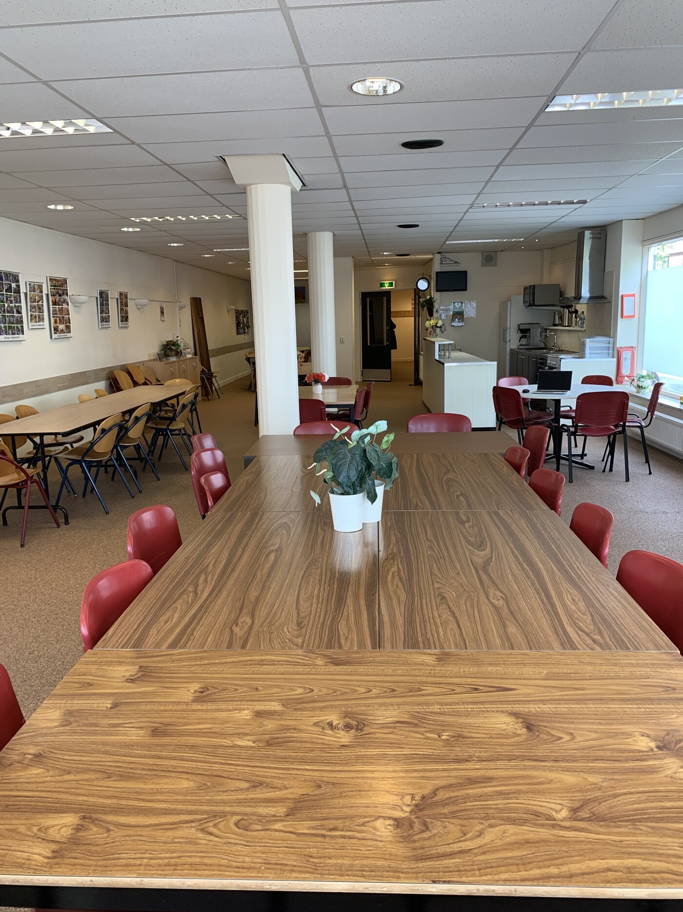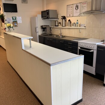 De ruimte is ingericht met tafels en stoelen (in meerdere opstellingen te gebruiken), keukenblok, geluidsinstallatie en WiFi.
