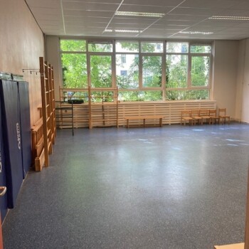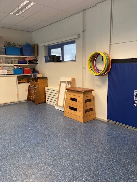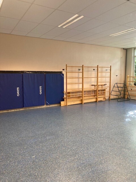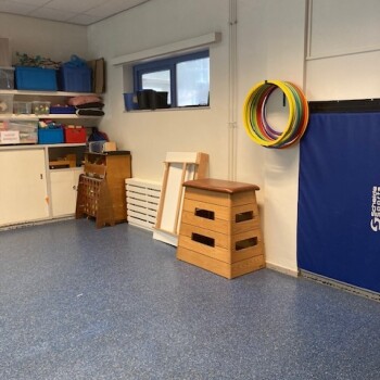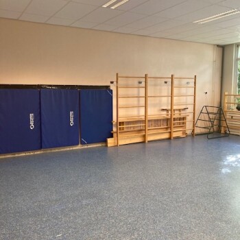 De speelzaal is voorzien van diverse materialen zoals matten, een klimrek, kast, diverse spel- en gymmaterialen.