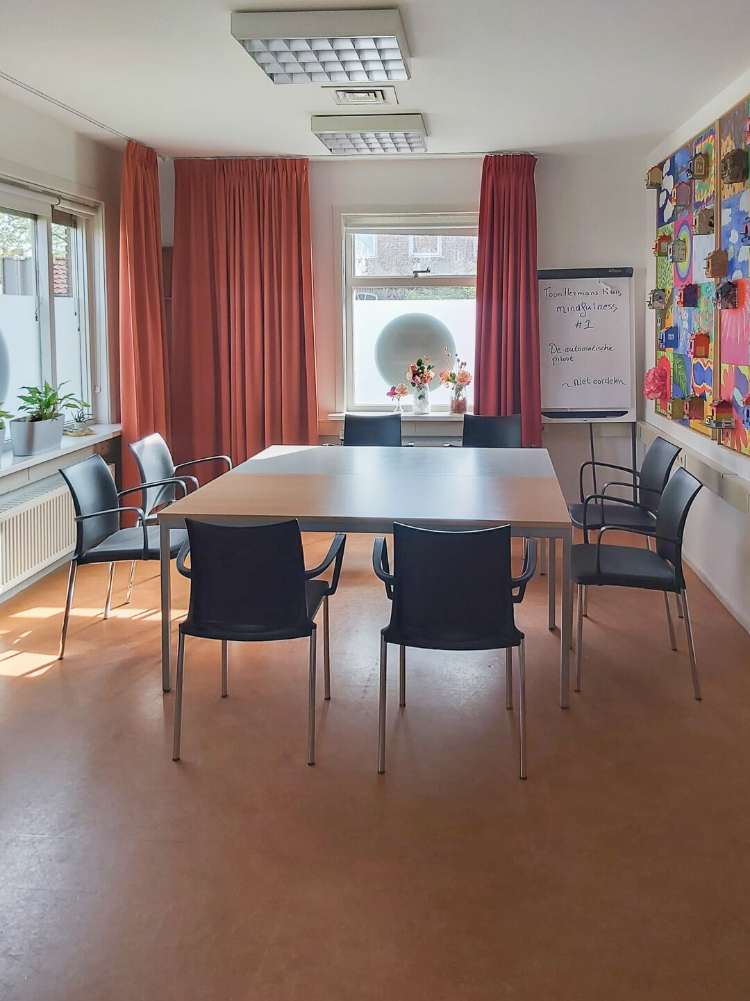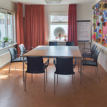 Onze vergaderruimte is te huur en is voorzien van tafels, stoelen, flipover en WiFi en is geschikt voor 8-12 personen.