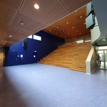 Het theater is een grote hoge ruimte met een zittribune (zonder stoelen/tafels). De ruimte is geschikt voor 150 personen (er is geen WiFi aanwezig).
