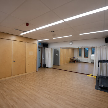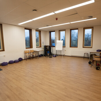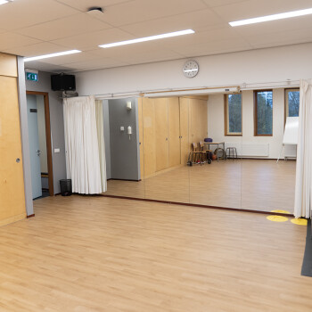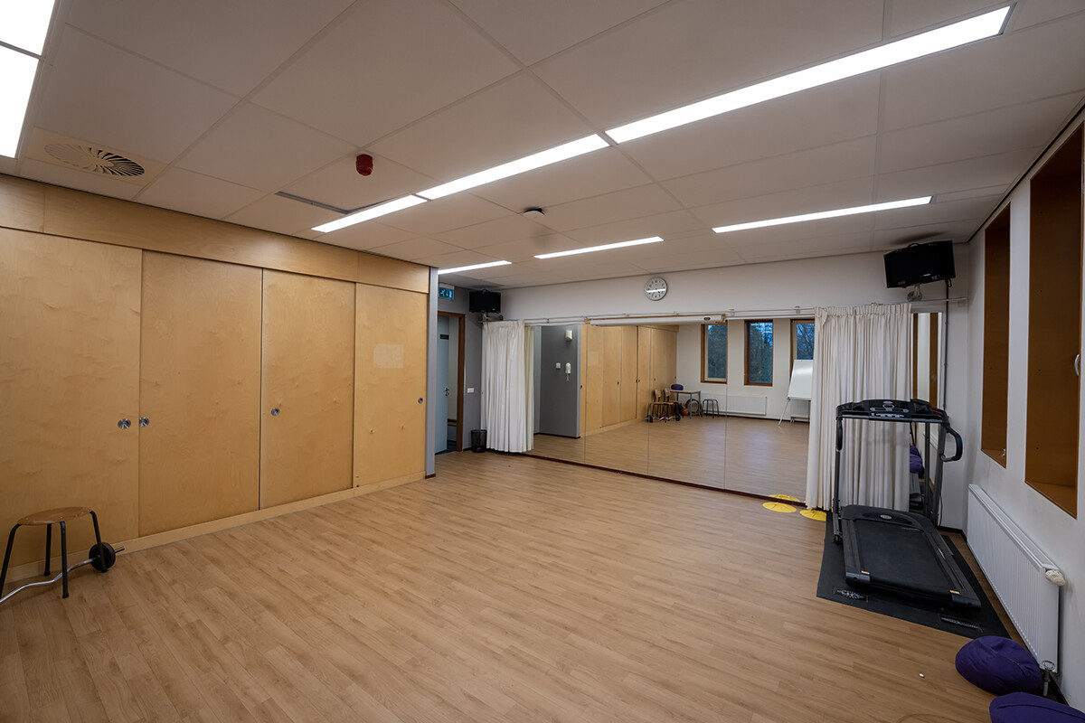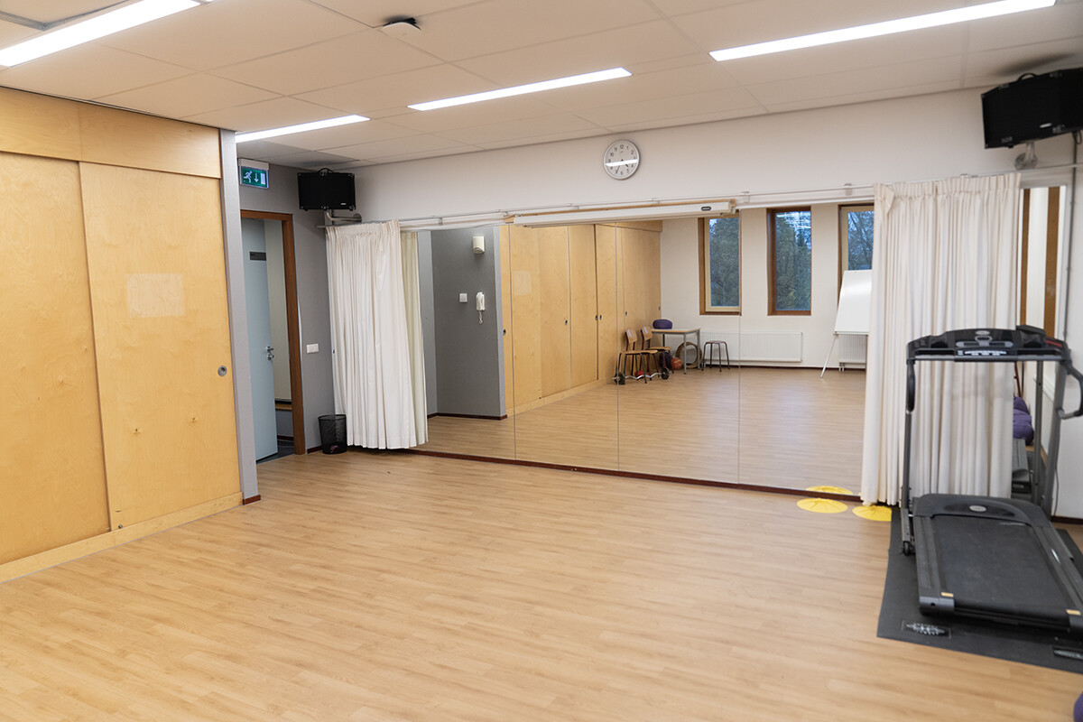 Het is een ruimte met ramen en heeft een spiegelwand (die af te dekken is door een gordijn), muziekinstallatie en Wifi. Er kan ook gebruik worden gemaakt van de naastgelegen kleedkamers