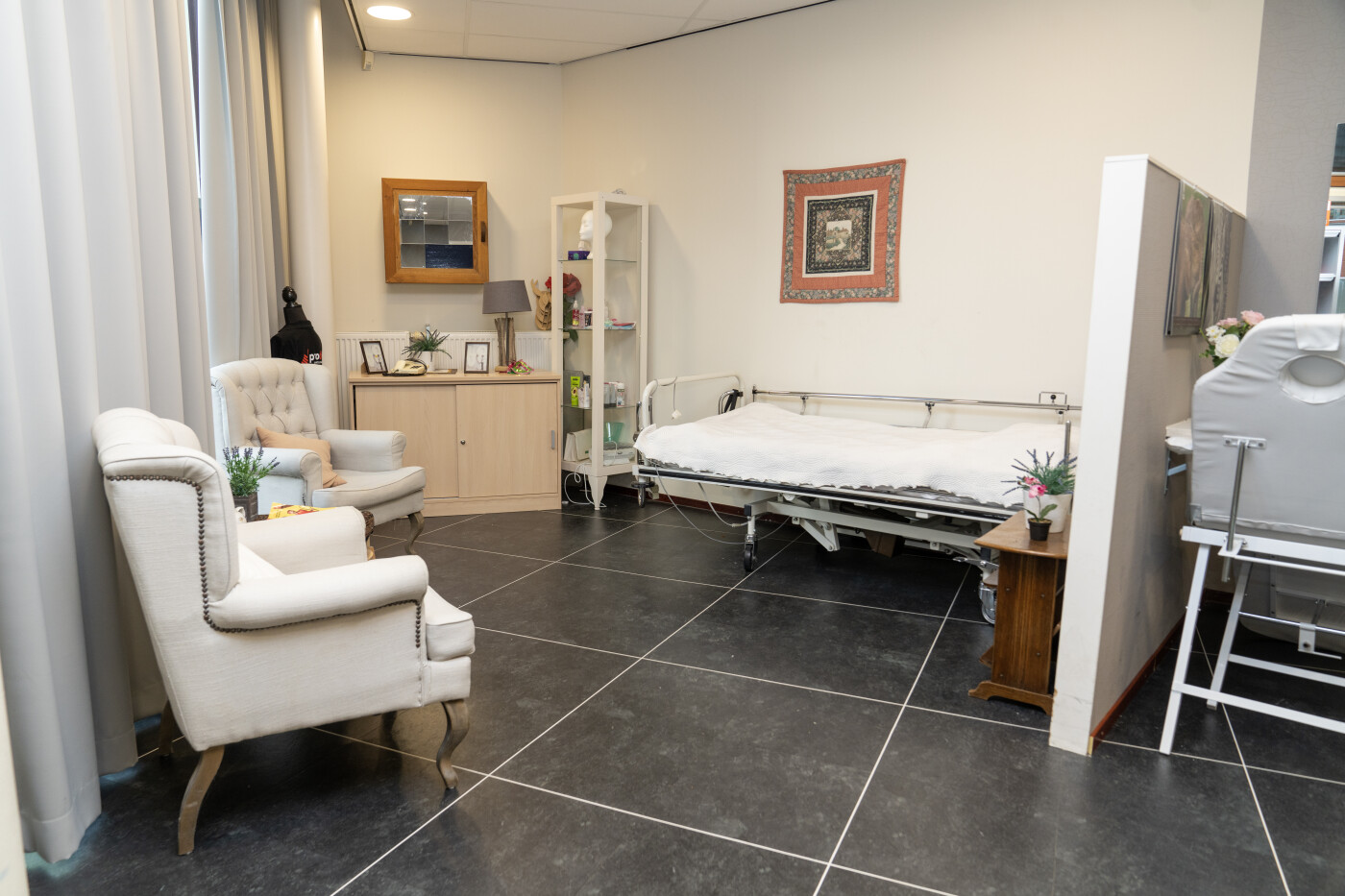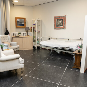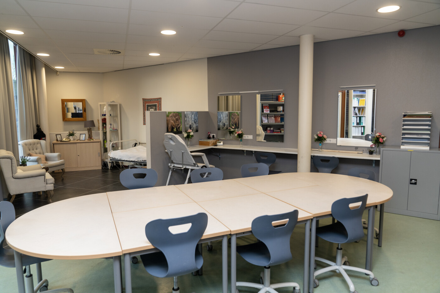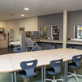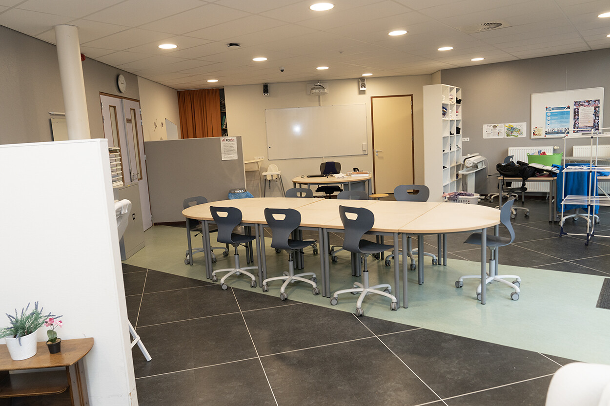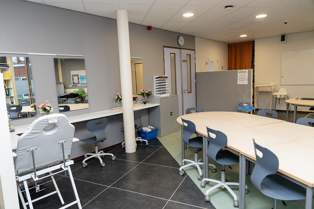 Het Zorglokaal ligt op de begane grond en is vanaf buiten direct te betreden. Het is ingericht voor praktijklessen voor de zorg. Er zijn diverse zorggeraleteerde meubels aanwezig (bijv. bed, behandelstoel, spiegelwand) maar heeft ook een vergadertafel met stoelen voor ca. 8-10 personen. Tevens is er Wifi beschikbaar.