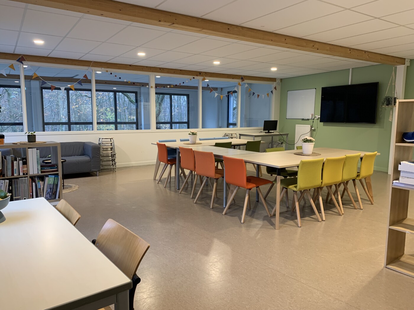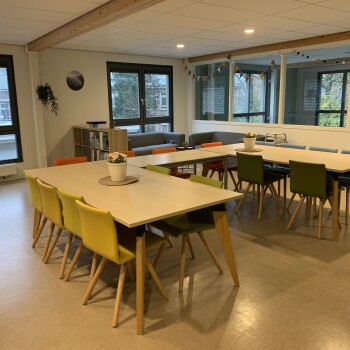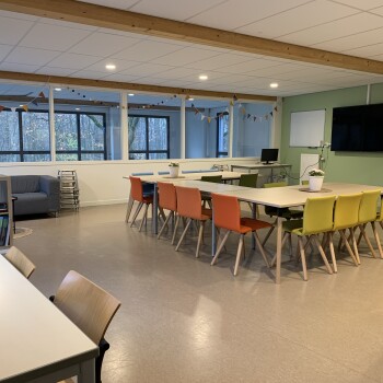 De Teamkamer ligt op de 1e etage die alleen per trap te bereiken is. Het is een sfeervolle lichte ruimte met tafels en stoelen die in meerdere opstellingen neer te zetten zijn. De ruimte is tevens voorzien van een whithboard, flipover, zithoek met banken, Tv-scherm met HDMI-aansluiting en Wifi. De ruimte en is geschikt voor max. 25 personen. Indien gewenst mag er (in overleg) van de keuken op de begane grond gebruik gemaakt worden.