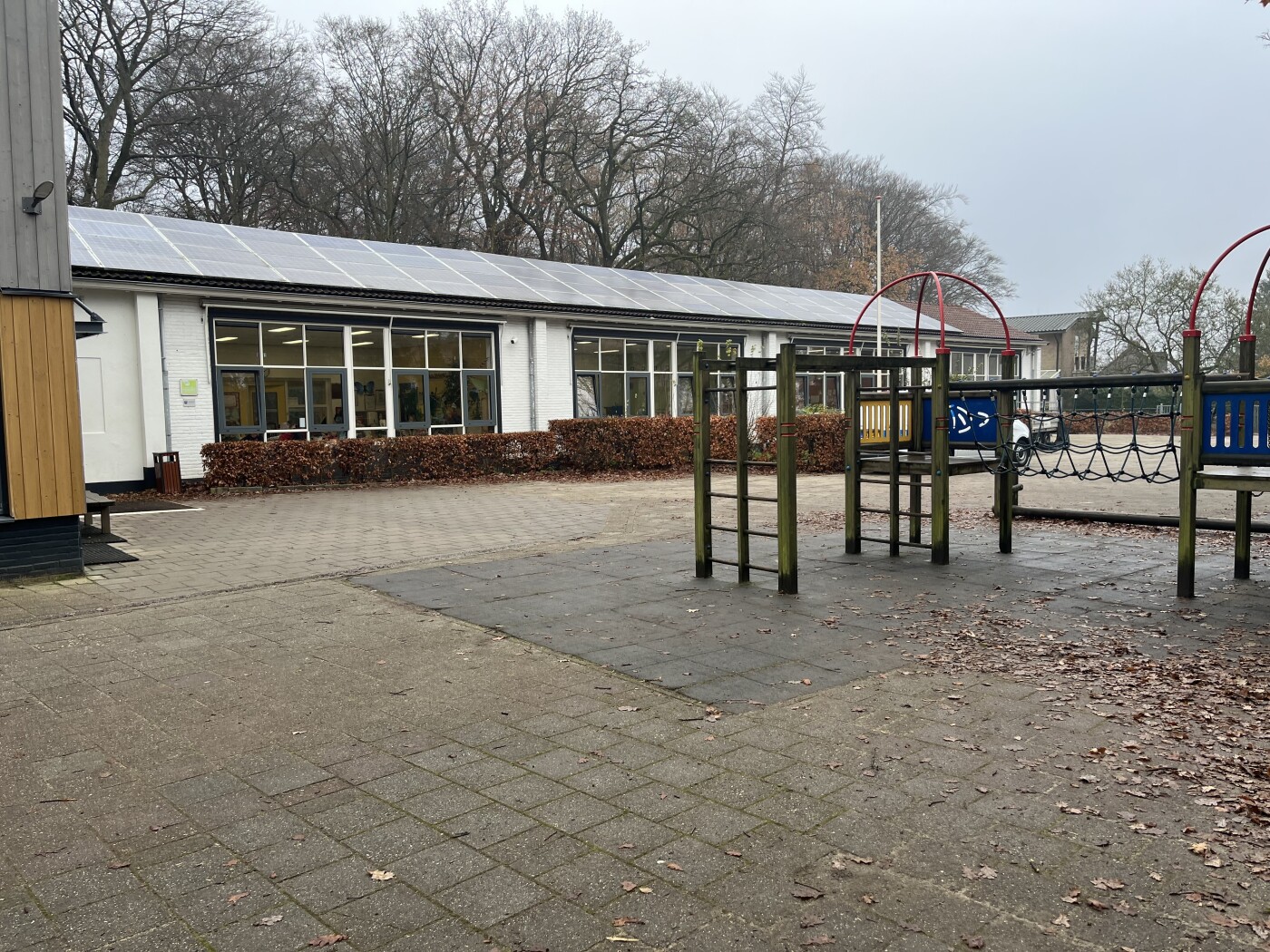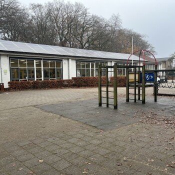 De Buitenruimte/schoolplein ligt in het groen en is grotendeels bestraat met tegels. Er zijn enkele speeltoestellen aanwezig en geschikt voor ca. 100-150 personen.