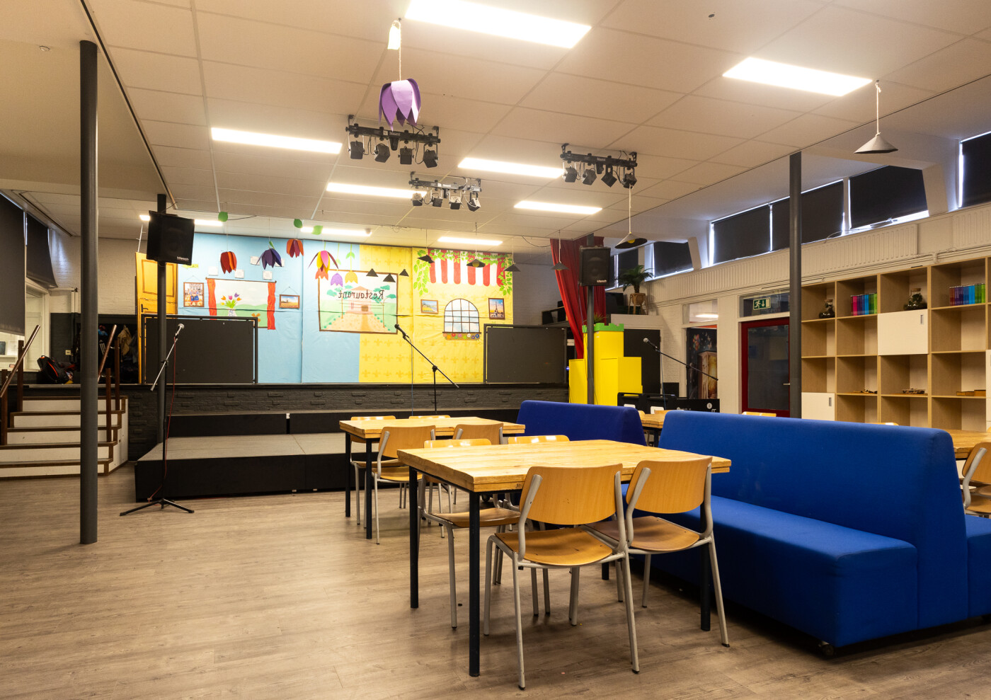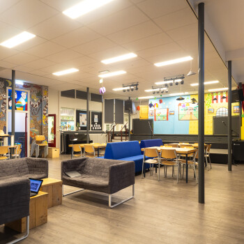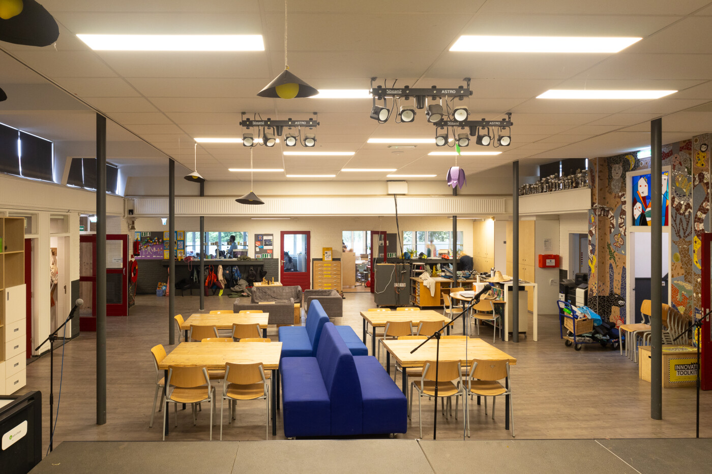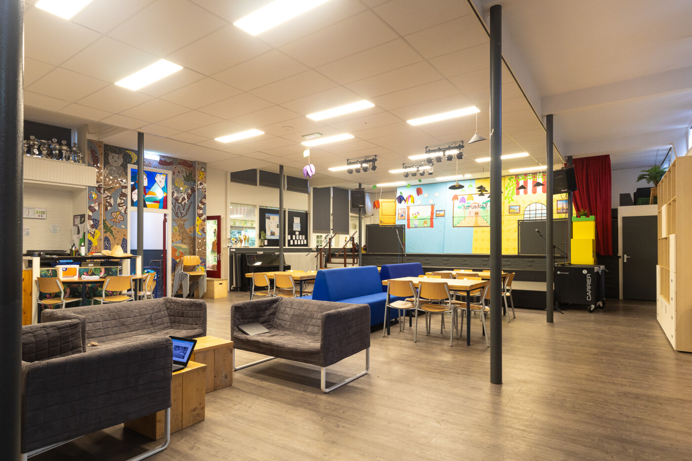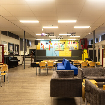 De Centrale Hal ligt in het hart van de school op de begane grond. Er zijn tafels, stoelen, banken, Wifi, (niet gestemde) piano en een podium. Ook is er een muziekinstallatie* , verrijdbaar digibord en flipover beschikbaar in vooraf overleg. De ruimte is geschikt voor ca. 50 personen.