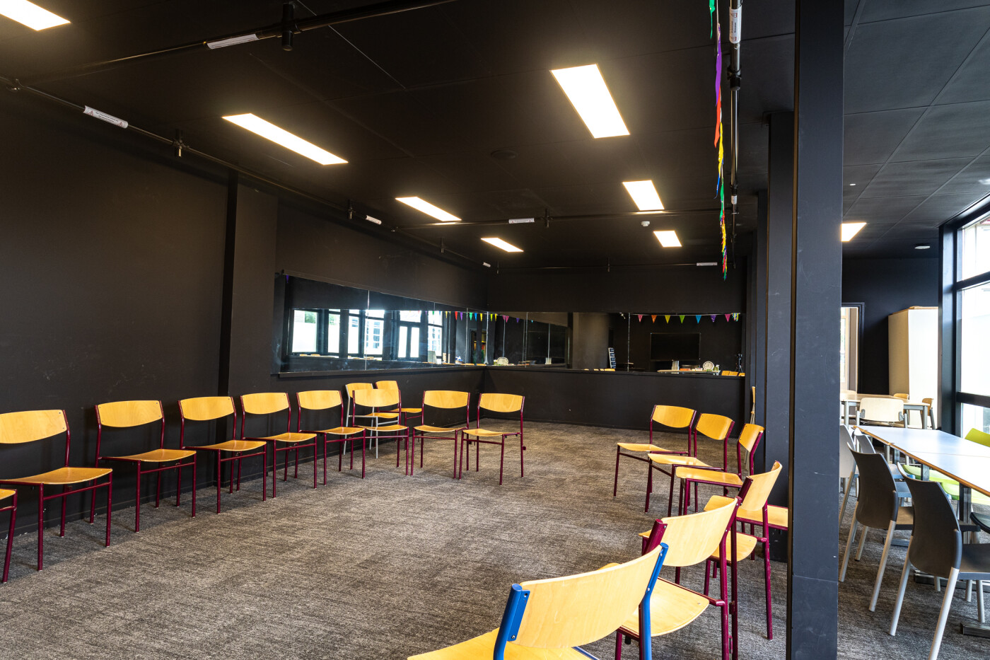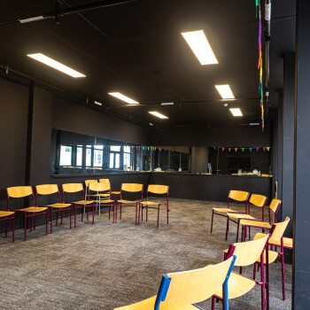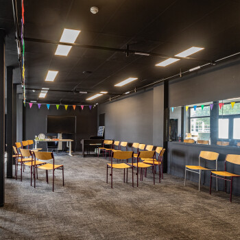 Het drama-lokaal is een sfeervolle ruimte met een donker plafond en is geschikt voor ca. 15 personen, maar dit is afhankelijk van de aard van de activiteit.