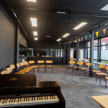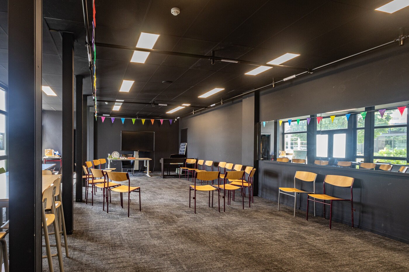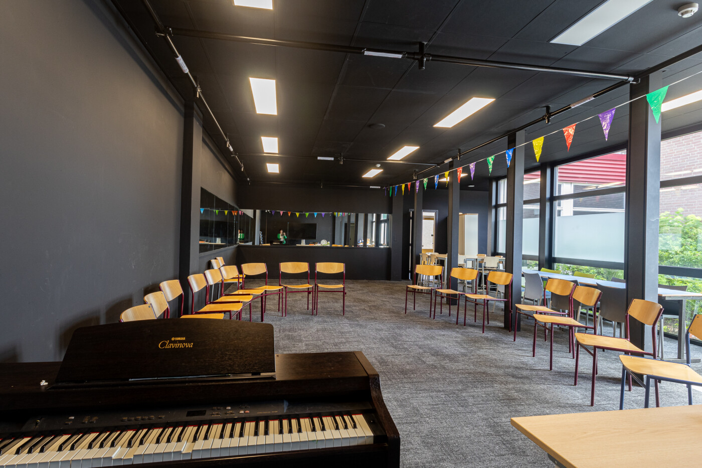 Het lokaal is voorzien van vloerbedekking, spiegelwand (met gordijnen) en is verder ingericht met stoelen, enkele tafels en een piano. Er is klimaatbeheersing en Wifi aanwezig.