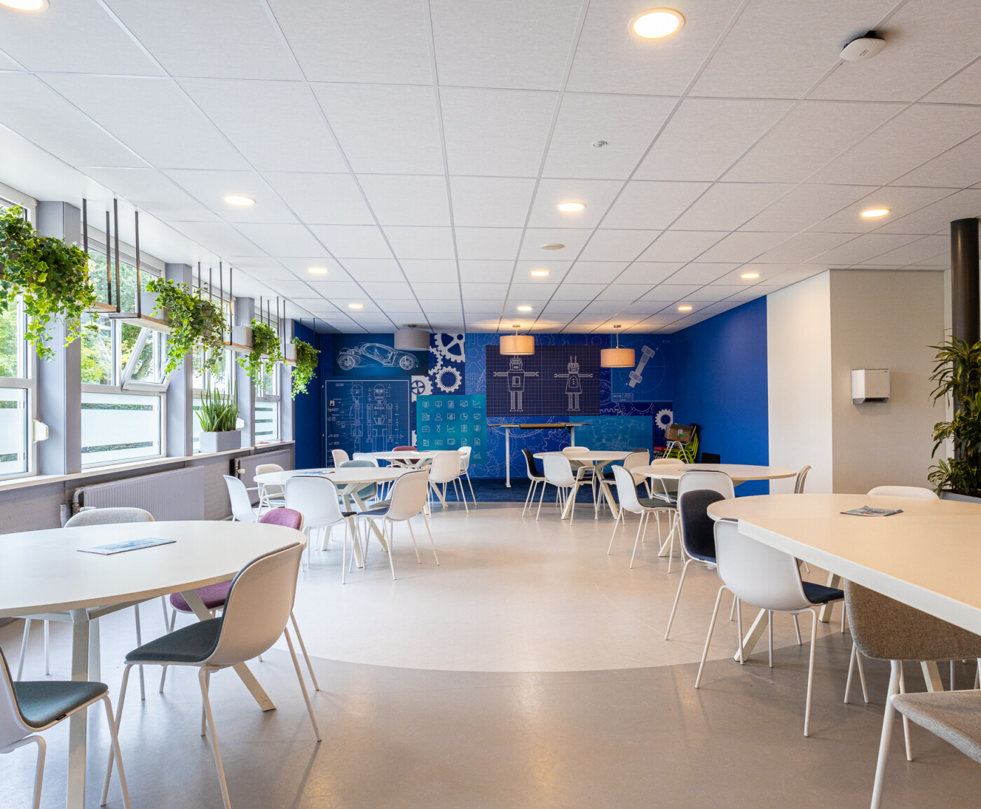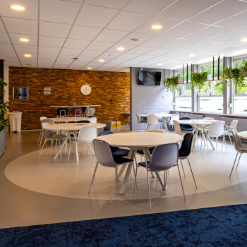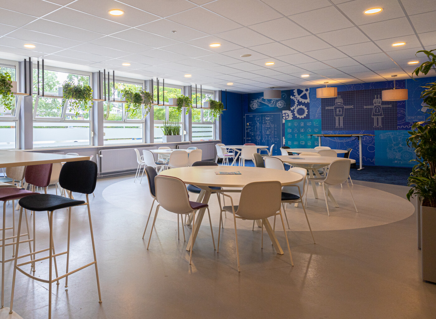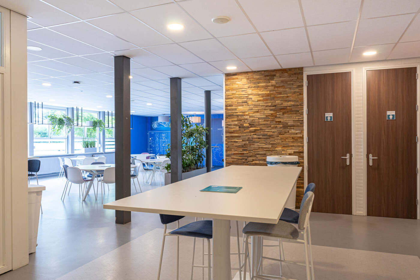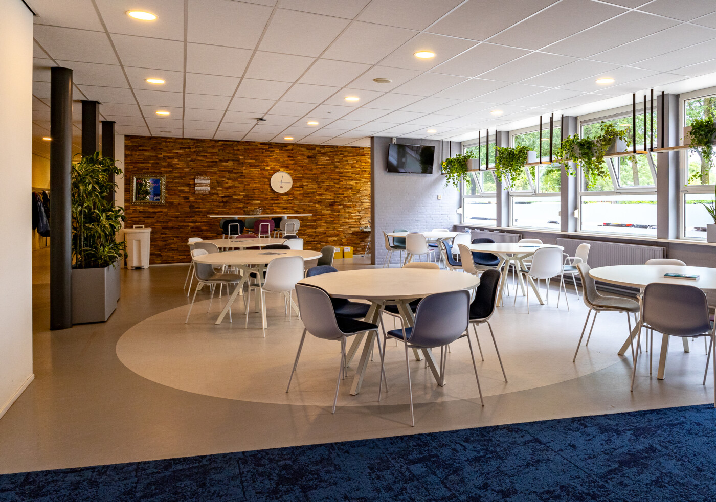Onze personeelskamer is een lichte, ruime en sfeervolle ruimte. Deze ruimte is ingericht met 6 grote witte ronde tafels met stoelen en enkele hoge tafels met hoge zitkrukken. Er is ruimte voor ca. 35 personen, maar is uit te breiden met losse stoelen tot ca. 80 personen, dit is mede afhankelijk van de stoel/tafelopstelling.