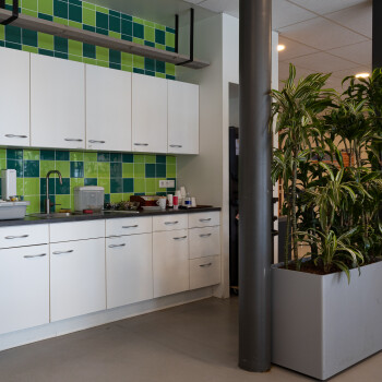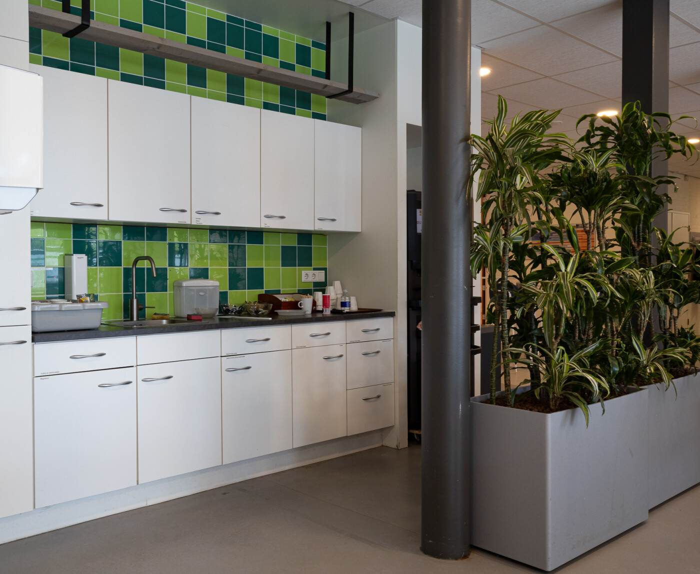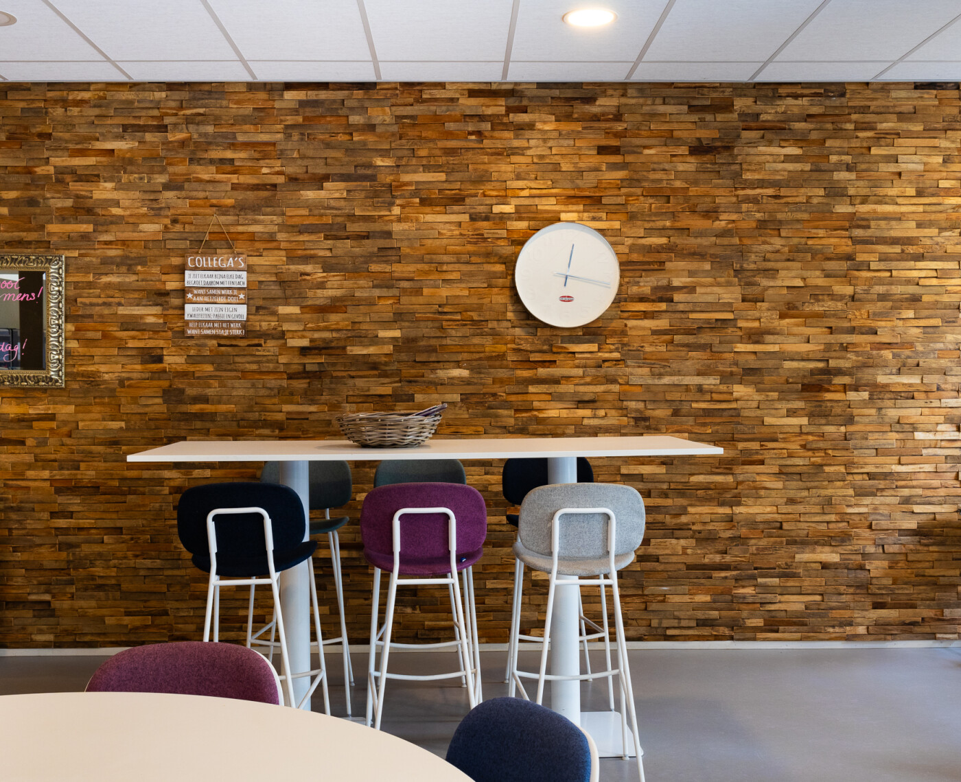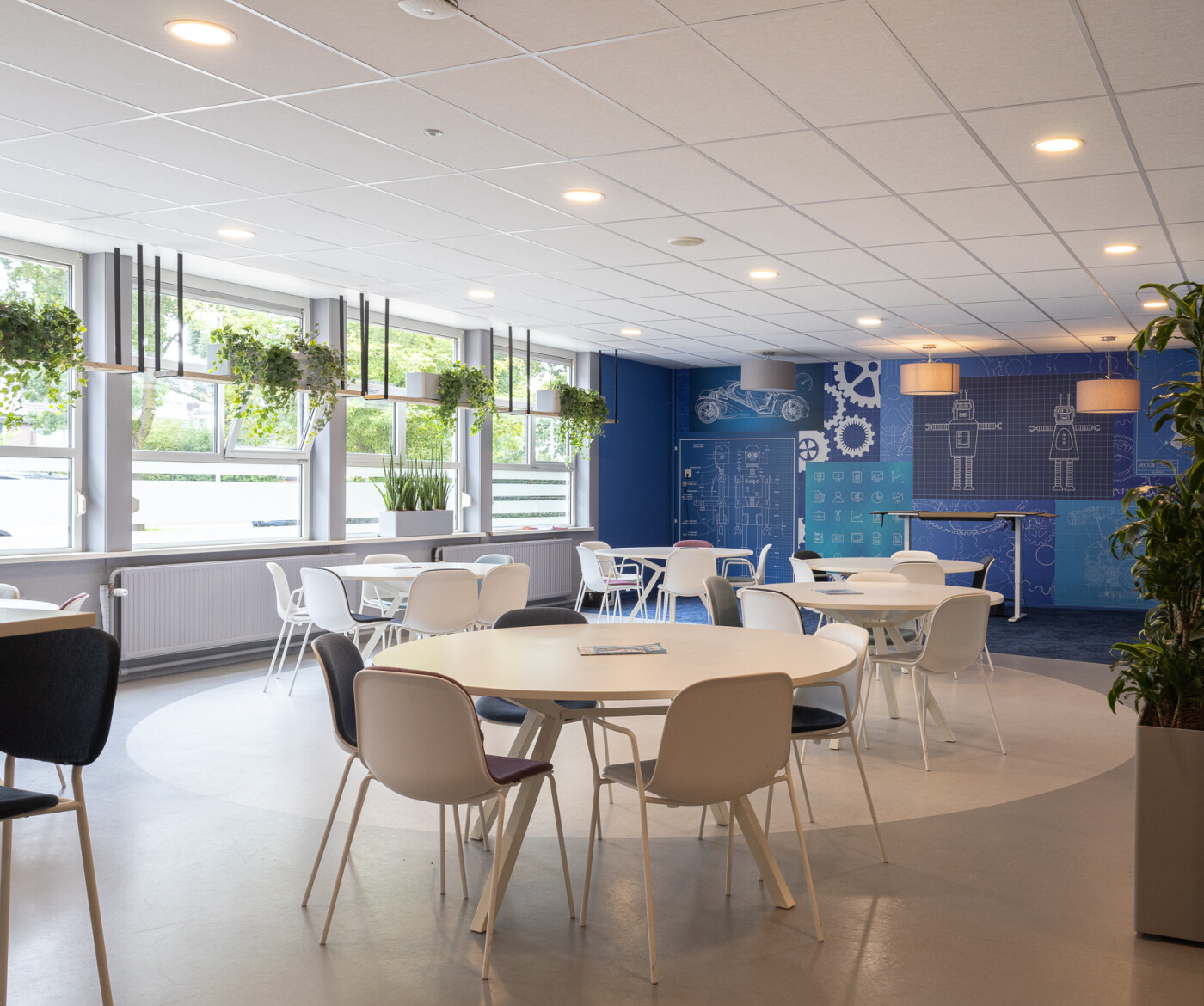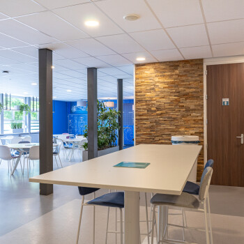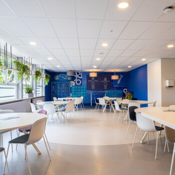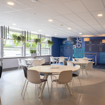 Onze personeelskamer is een lichte, ruime en sfeervolle ruimte. Deze ruimte is ingericht met 6 grote witte ronde tafels met stoelen en enkele hoge tafels met hoge zitkrukken. Er is ruimte voor ca. 35 personen, maar is uit te breiden met losse stoelen tot ca. 80 personen, dit is mede afhankelijk van de stoel/tafelopstelling.