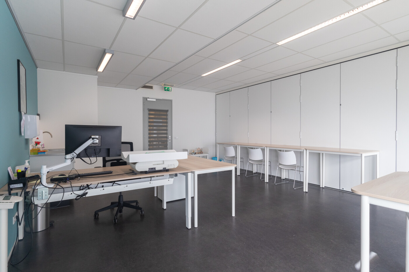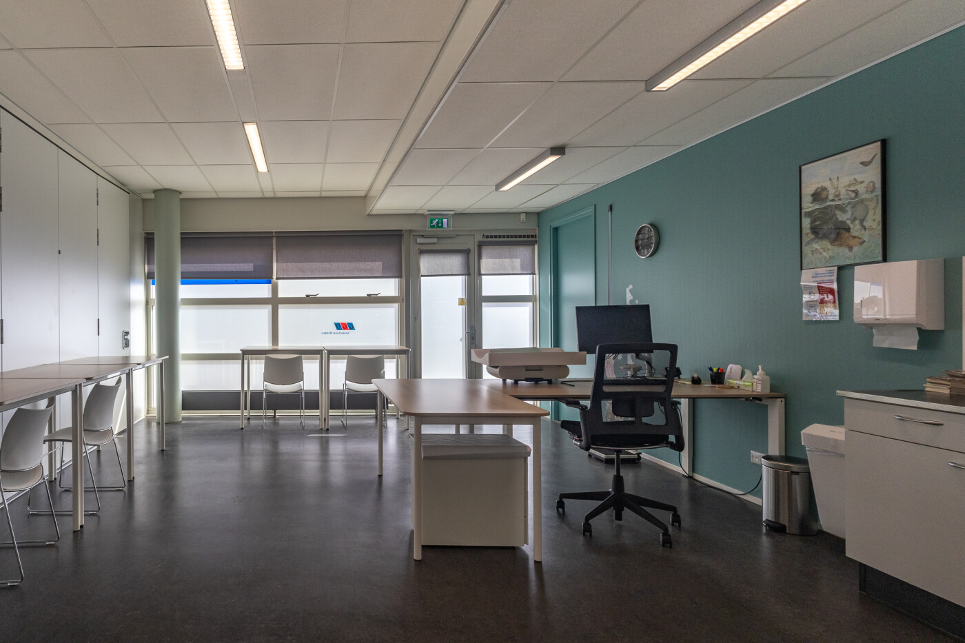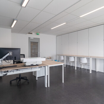 De ruimte is ingericht met een buro en tafels (die hoger zijn dan gebruikelijk) en stoelen.