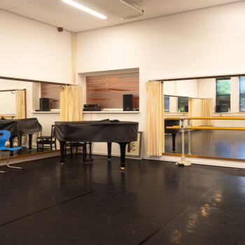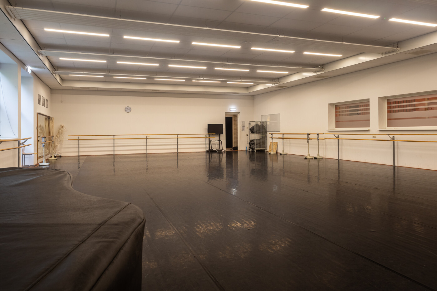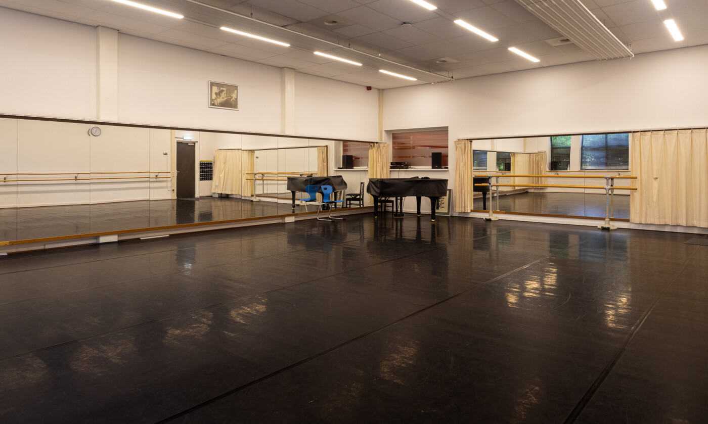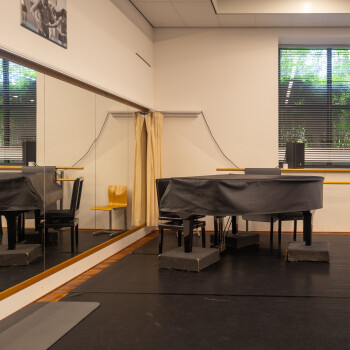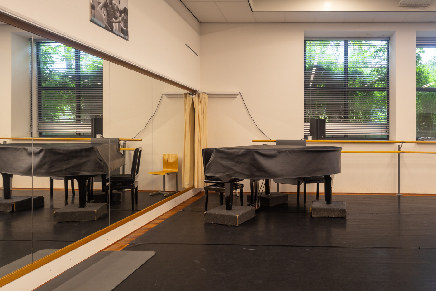 Beide danszalen zijn voorzien van: zwevende houten dansvloer, spiegelwand met gordijnenen, barres, vleugel, geluidsinstallatie en wifi.
