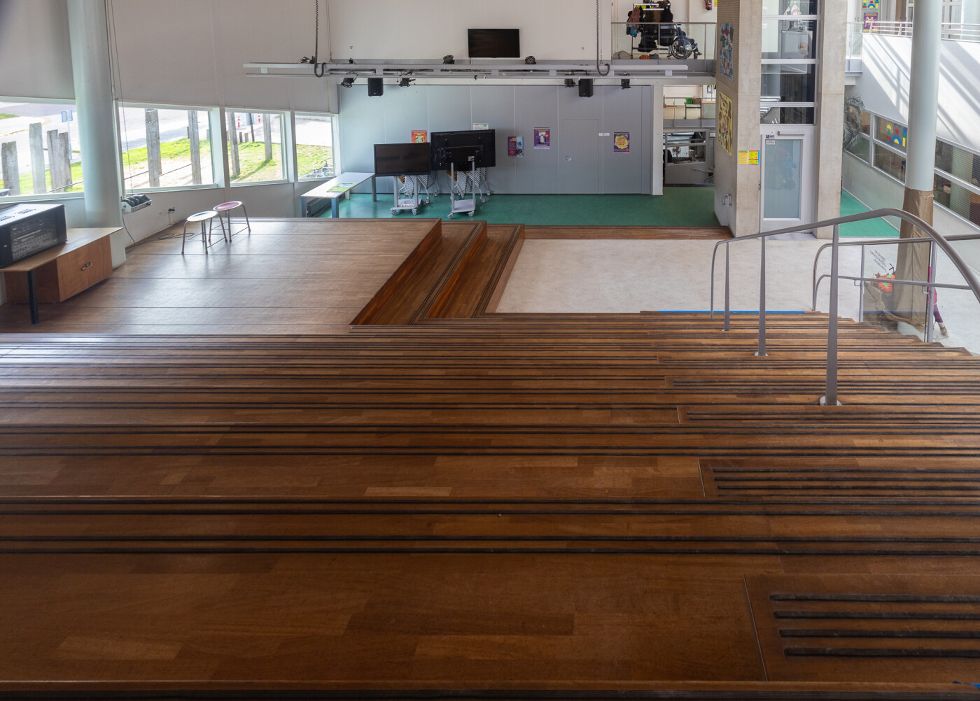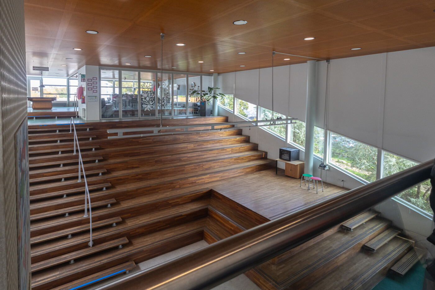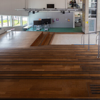 De Spilruimte is uit te breiden (tegen meerprijs) met de Aula. De Aula is d.m.v. schuif-glas-wand gescheiden van de Spilruimte en ligt een verdieping lager. Door beide samen te voegen kan het als een presentatieruimte (met podium) gebruikt worden. De aanwezige trappen kunnen dan als zittribune gebruikt worden. Bij gebruik van deze combinatie is de ruimte geschikt voor 125 personen.