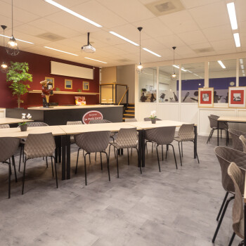 Het is een kleurrijke ruimte en voorzien van tafels, stoelen en een uitgiftebuffet/bar. Er is wifi en tegen meerprijs is er ook een beamer aanwezig.