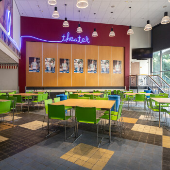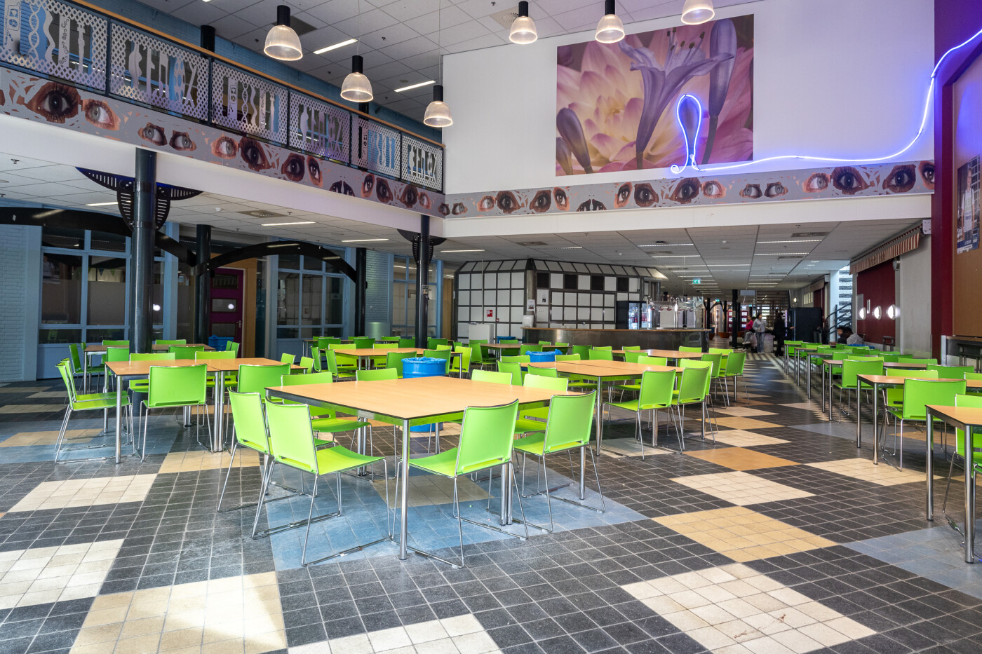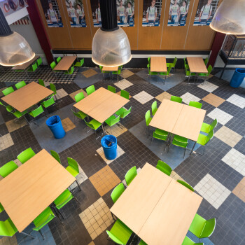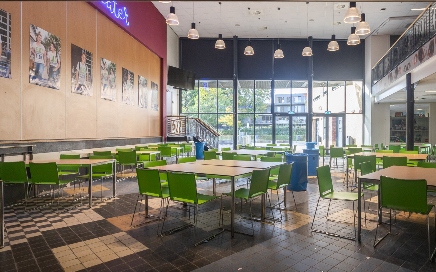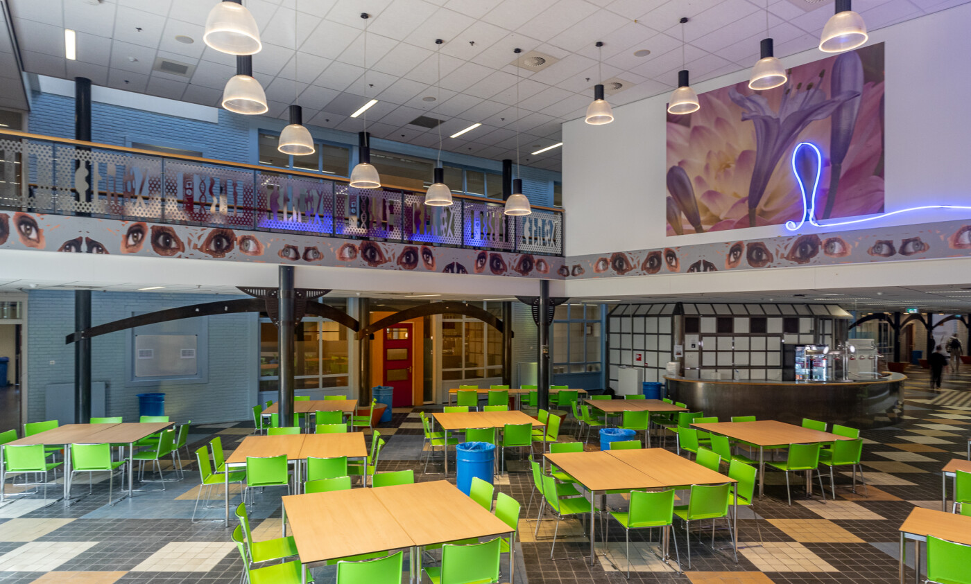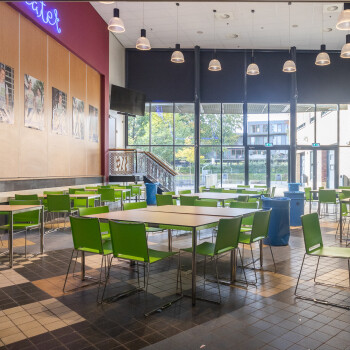 Onze grote kleurrijke aula is geschikt voor ruim 100 personen en is ingericht met tafels en stoelen, die in meerdere opstellingen neer te zetten zijn. In de ruimte is verder een uitgiftebar, wifi, TV en evt. een verrijdbare beamer aanwezig.