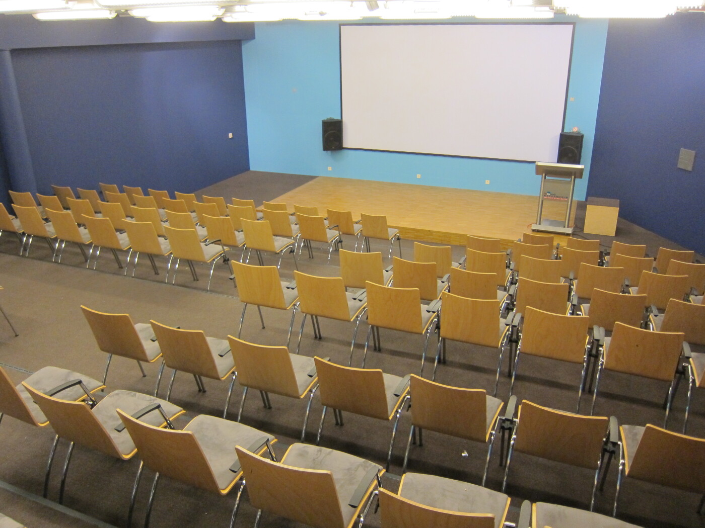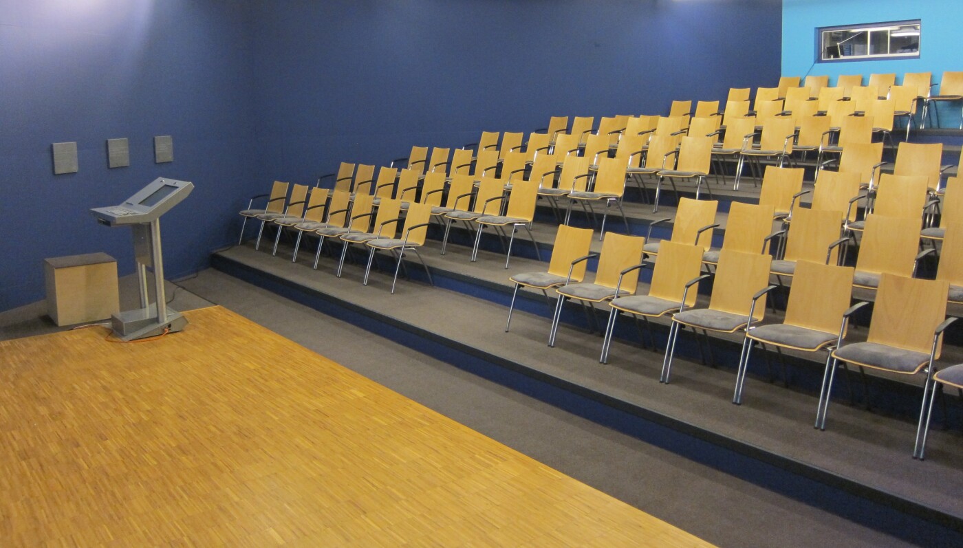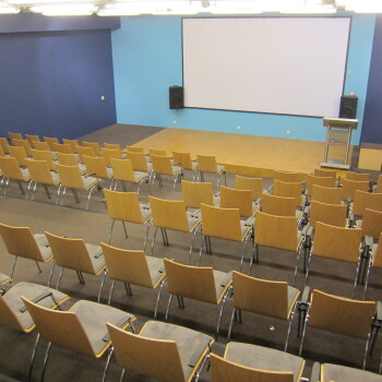 De zaal biedt ruimte aan 120 personen in theateropstelling en is uitgerust met een podium, beamer, 5x3m scherm, digitale lessenaar, geluidsinstallatie en WiFi. De opstelling is niet wijzigbaar en de ruimte beschikt niet over daglicht.