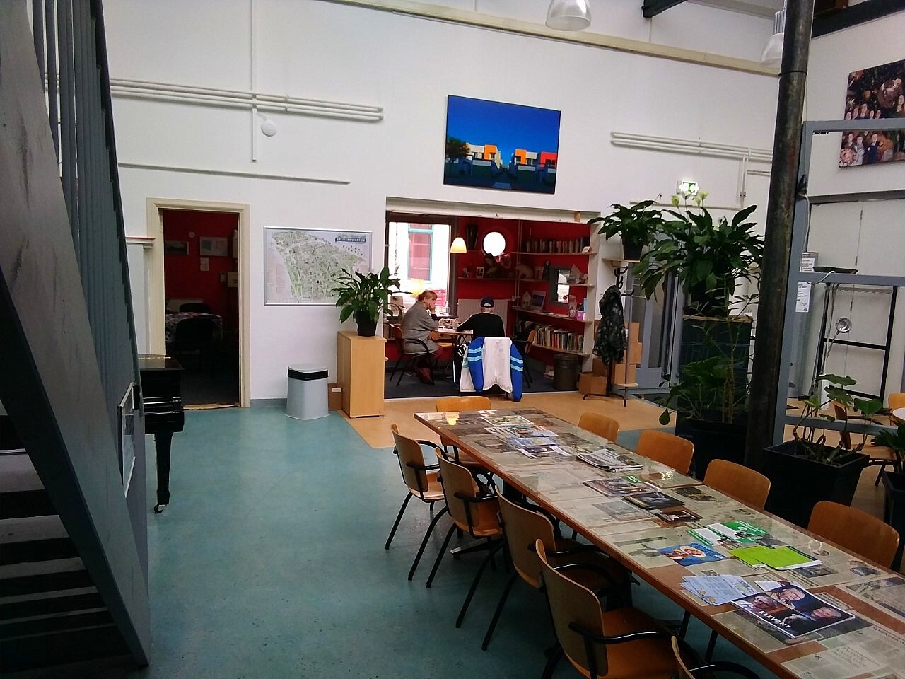 Het Voorplein is de entree en het hart van het buurthuis. Het is een ruimte lichte ruimte, ingericht met diverse zitjes en tafels, geschikt voor ongeveer 25 personen, uit te breiden tot ongeveer 60 zitplaatsen.