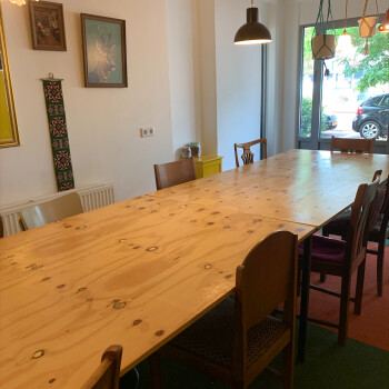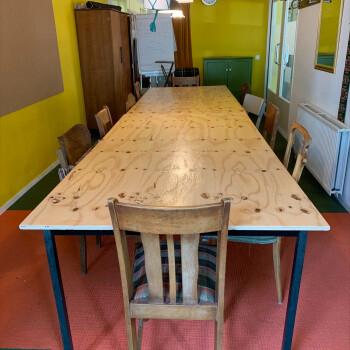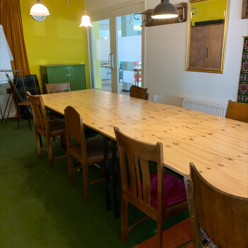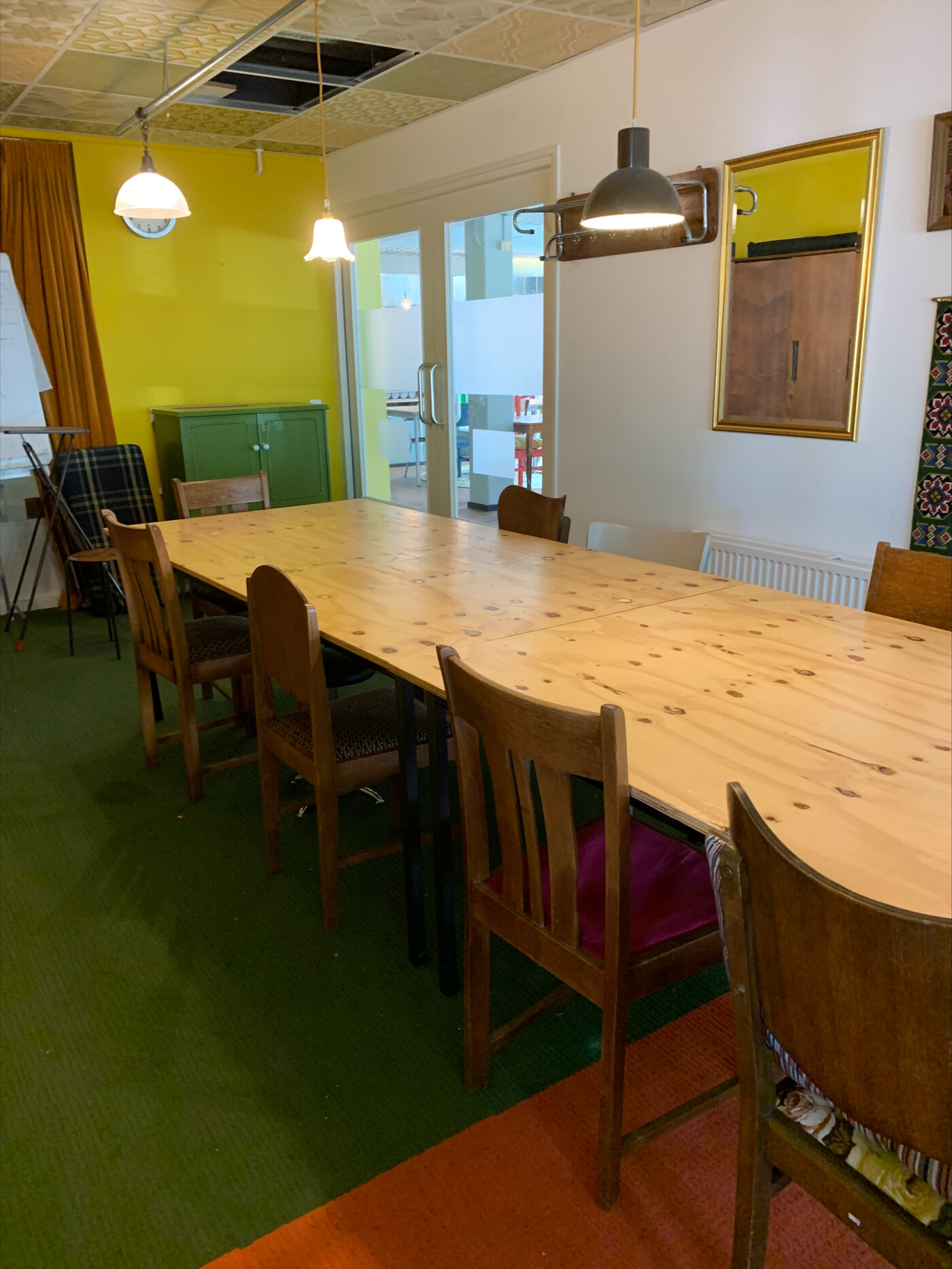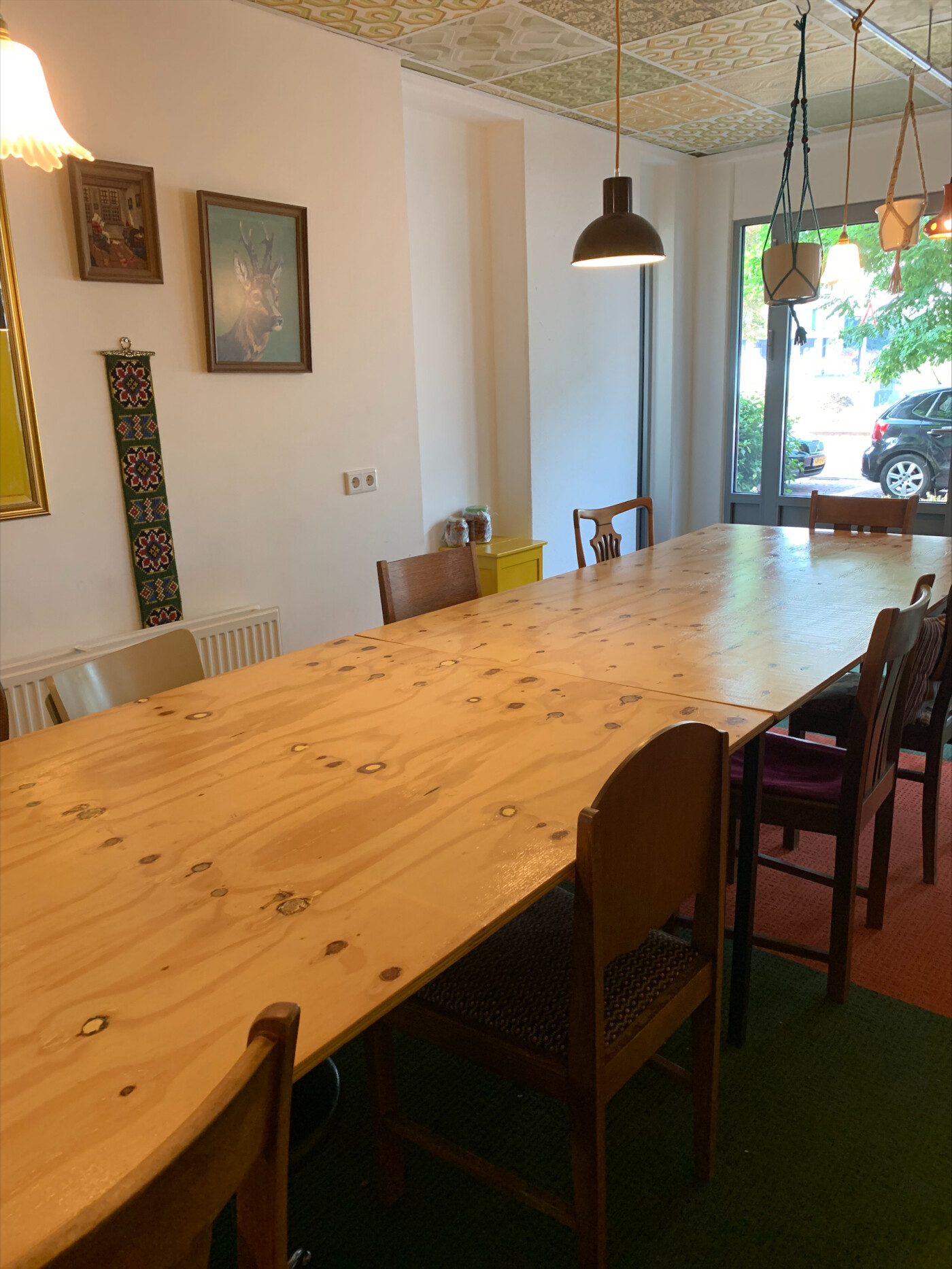 De Vergaderruimte heeft een vintage inrichting en voorzien van een lange tafel met stoelen. Deze ruimte is geschikt voor max. 12 personen. Er is een beamer, flipover, TV-scherm en WIFI aanwezig.