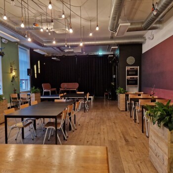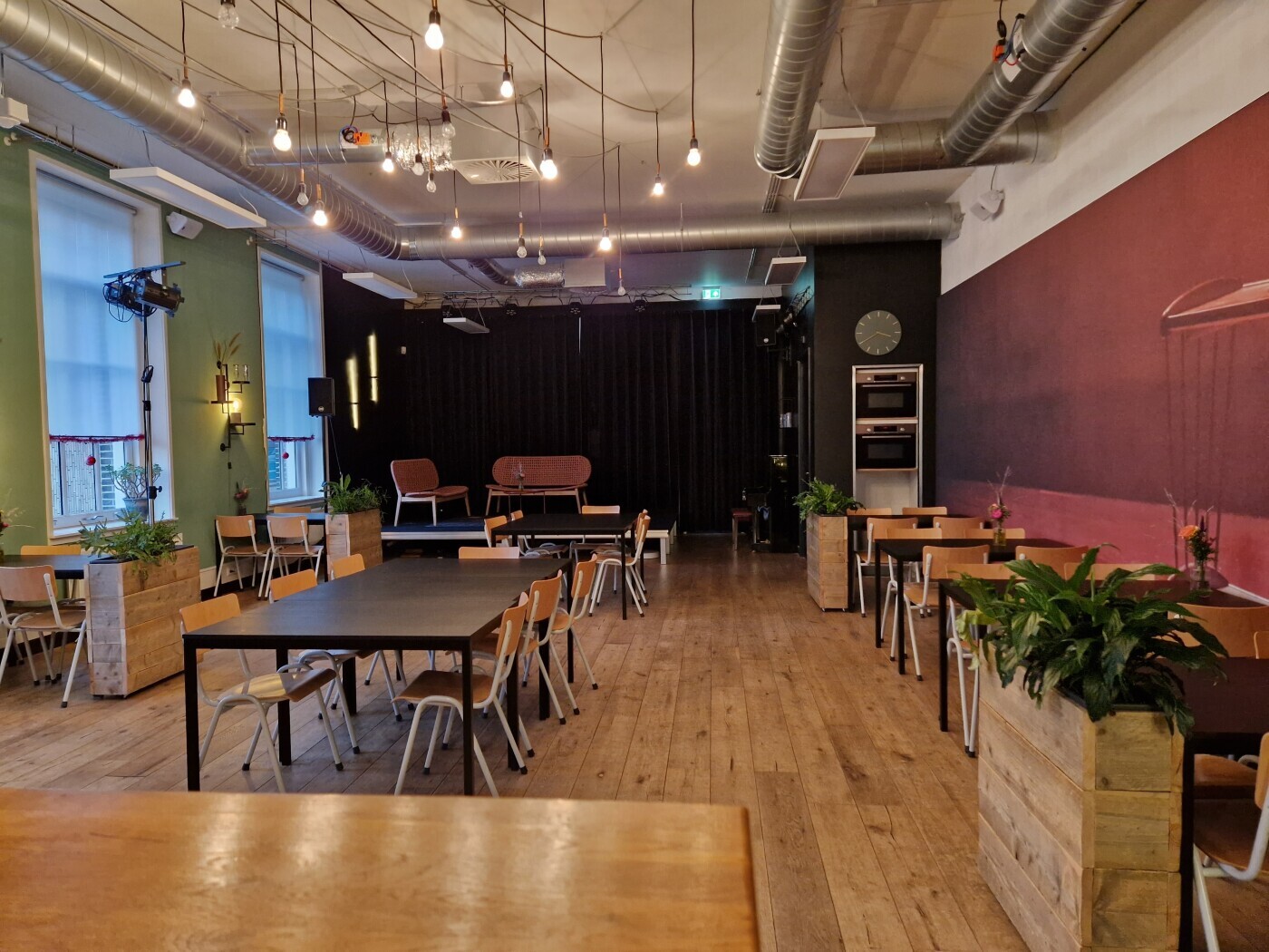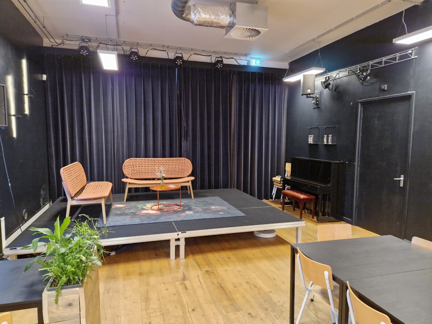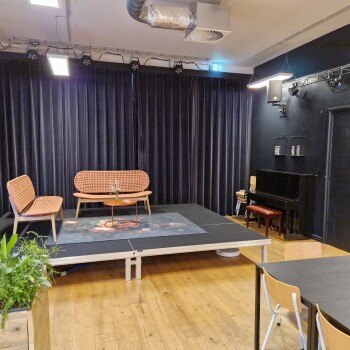 Deze ruimte is voorzien van tafels, stoelen, podium, bar, licht- en muziekinstallatie en microfoons, piano, klimaatbeheersing en WiFi. Het max. aantal personen bedraagt 80.