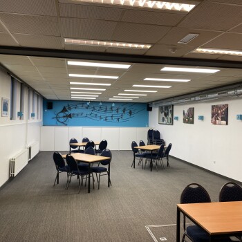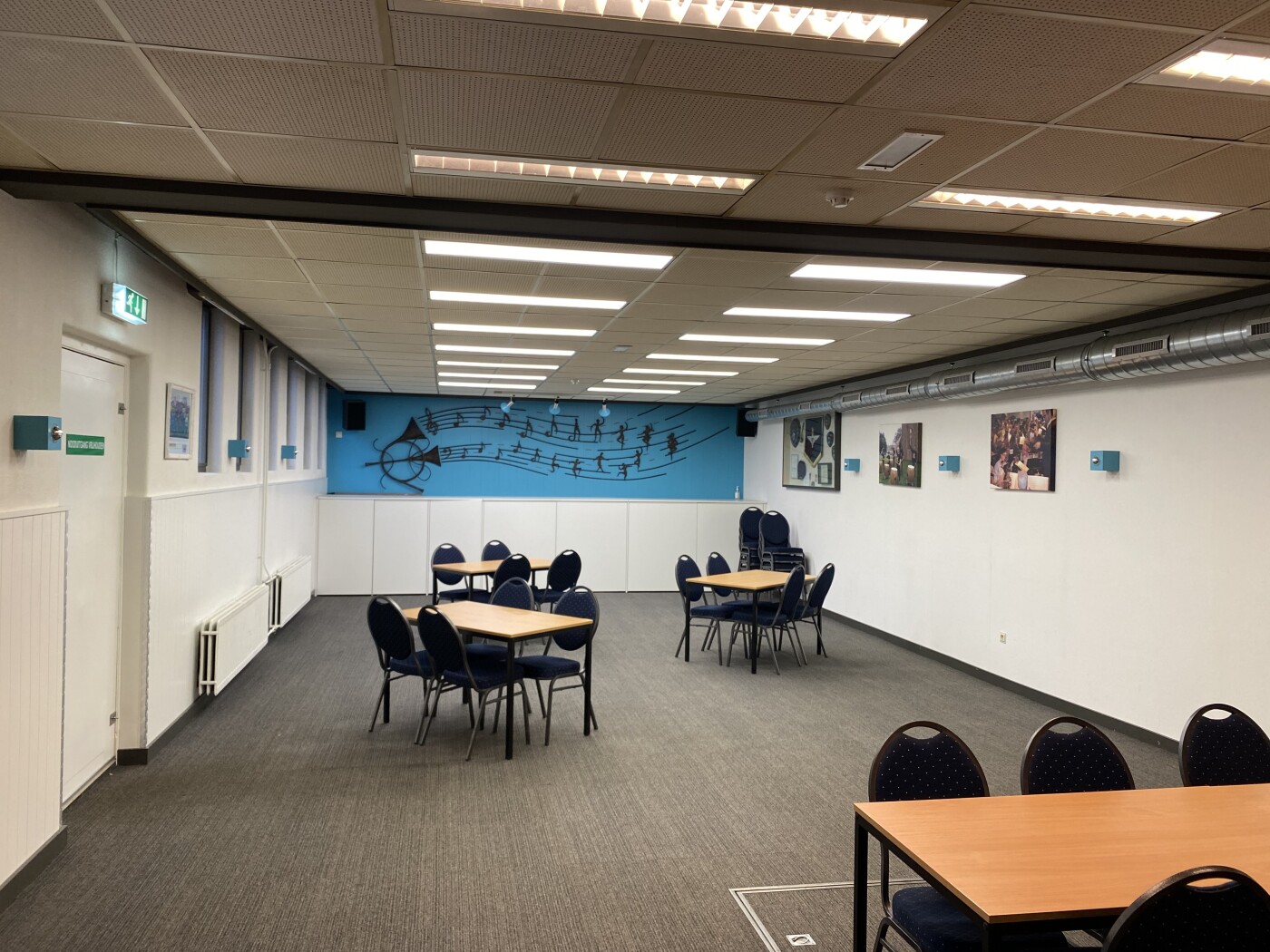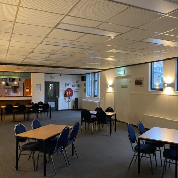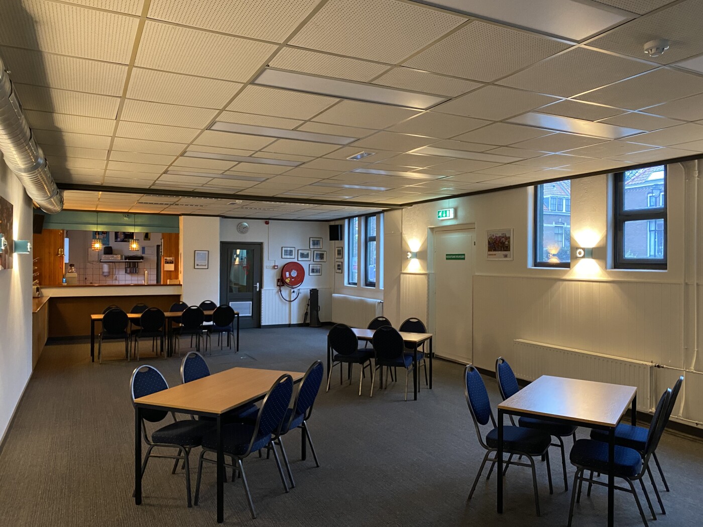 De grote zaal is dagelijks te huur voor zowel overdag als de avonden en is geschikt voor max. 45 personen en is voorzien van tafels+ stoelen, radio, WiFi, bar.