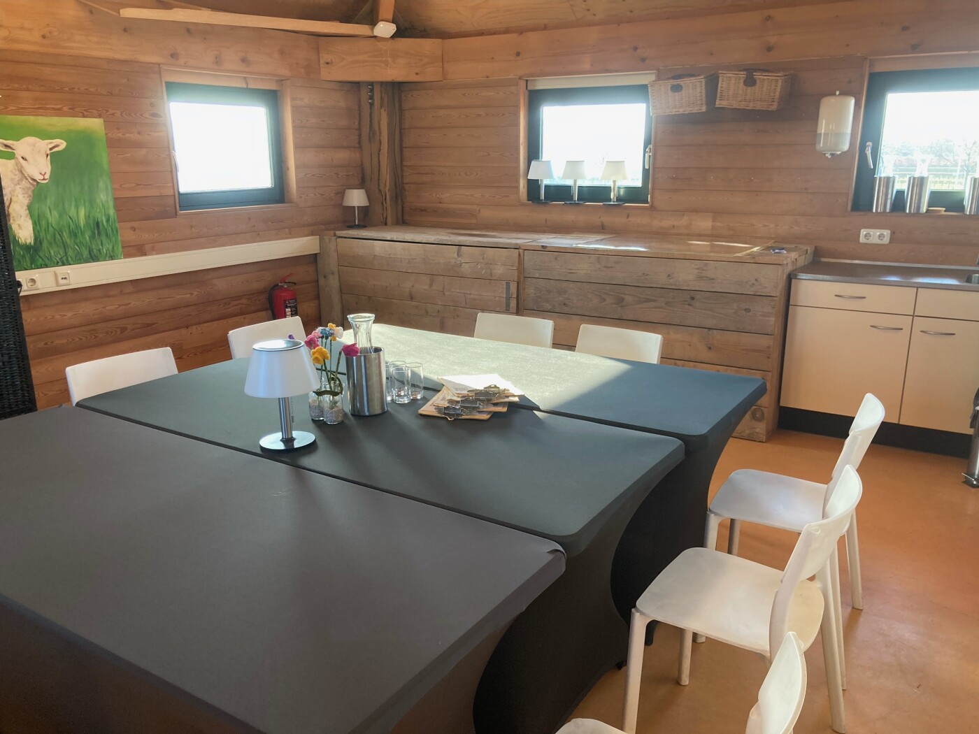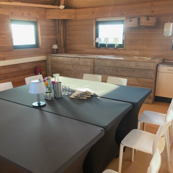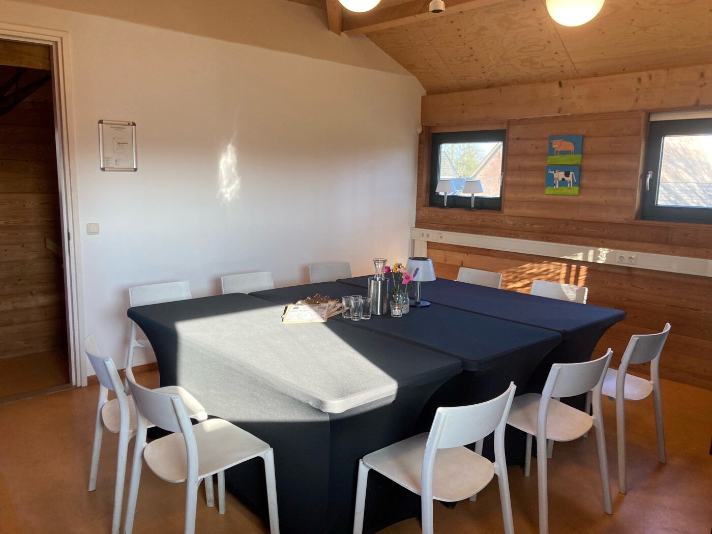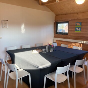 De vergaderzaal is gelegen op de bovenverdieping (met trap te bereiken) en geeft een mooi uitzicht op de groene omgeving. Deze ruimte is geschikt voor max. 16 personen en is voorzien van stoelen, tafels, gratis WiFi. Er is ook een flip-over en beamer beschikbaar tegen meerprijs.