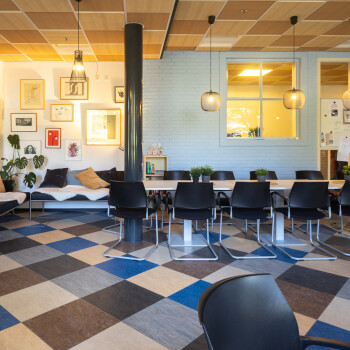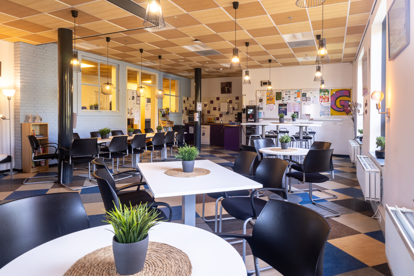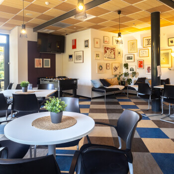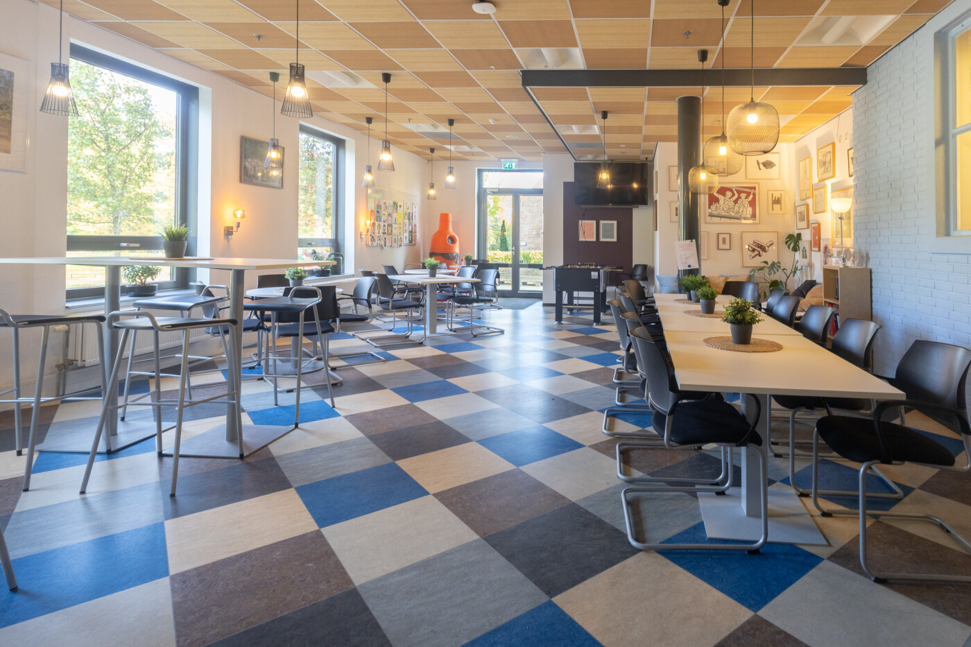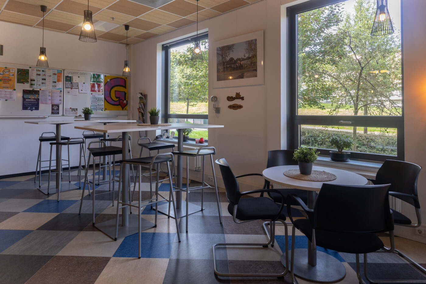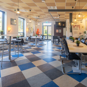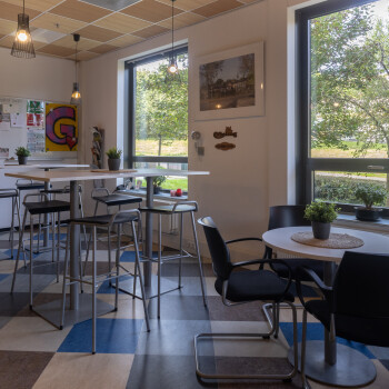 De personeelsruimte ligt op de begane grond en is geschikt voor ca. 40 personen. Het is een sfeervolle ruimte met een warme uitstraling. Deze ruimte is voorzien van een kleurrijke vloer en is ingericht met diverse soorten tafels en stoelen (hoog en laag) en een zithoek. Er is een pantry met spoelbak aanwezig en er is Wifi.