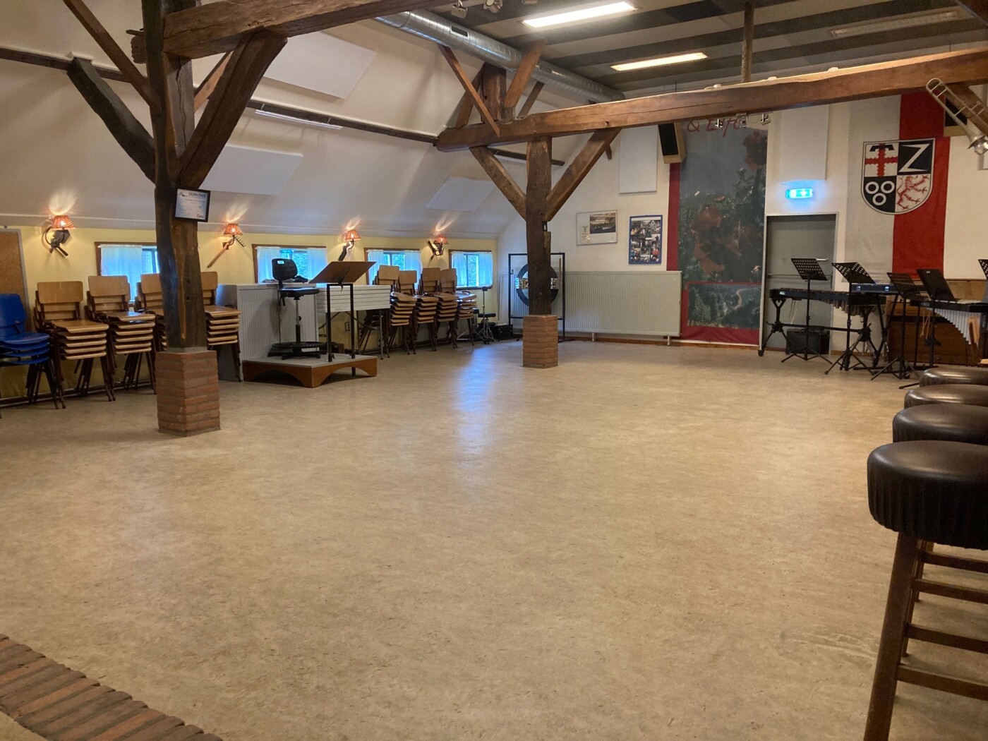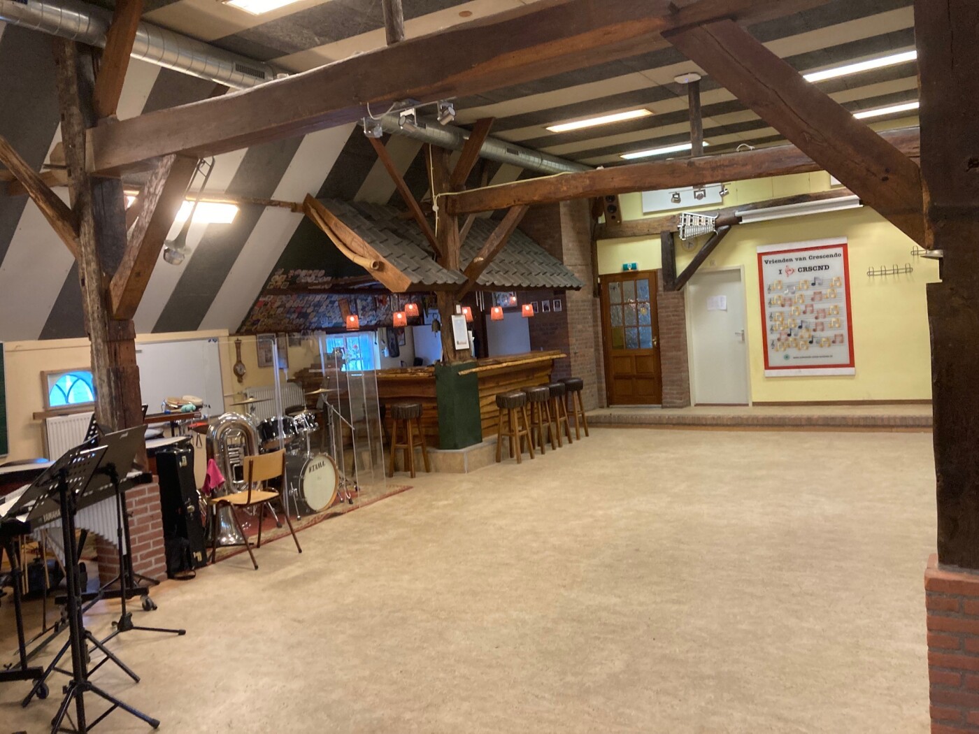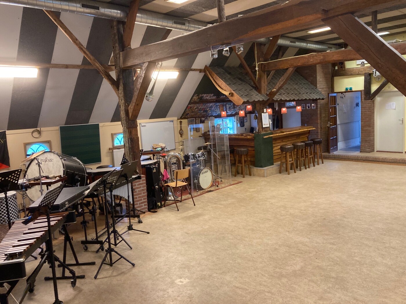 De repetitieruimte is geschikt voor max. 50 muzikanten en is voorzien van stoelen, opklaptafels, geluidsinstallatie, barfaciliteiten (koelkast, magnetron, koffie/theefaciliteiten, vaatwasser) en WiFi.